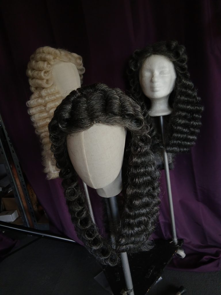 Drei klassische Allongeperücken in strengen Locken für Amtspersonen im 18. Jahrhundert. Hier angefertigt für die Darstellung der Richter in einem Hexenprozess einer schwäbischen Narrenzunft.